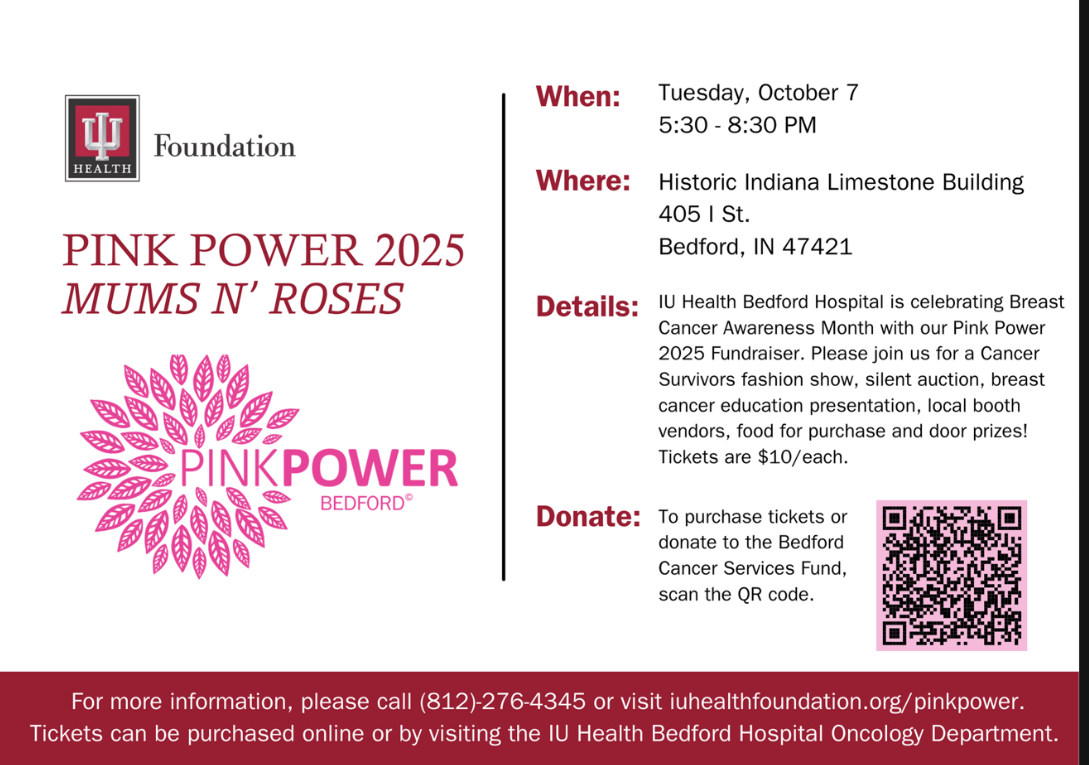 * IU Health Bedford Hospital, having a Pink Power, Mums & Roses 2025, Breast Cancer Awareness event, Tuesday Oct 7th details here